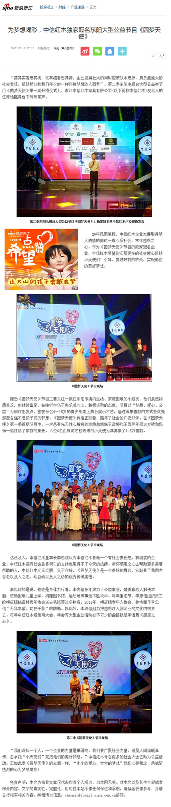 新浪网:为梦想喝彩,中信红木独家冠名东阳大型公益节目《圆梦天使》