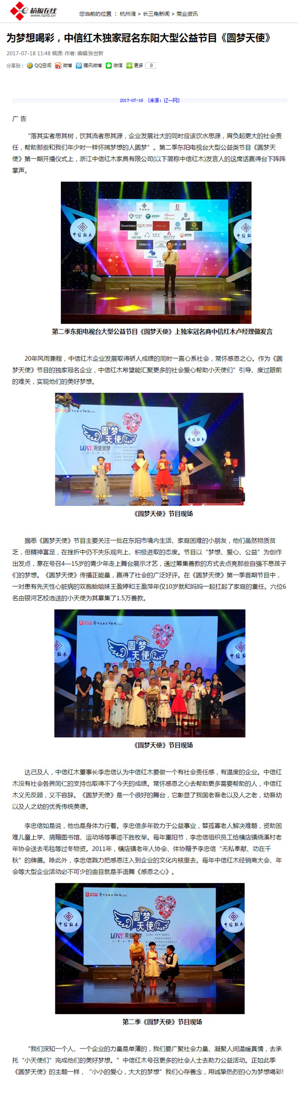 杭州网:为梦想喝彩,中信红木独家冠名东阳大型公益节目《圆梦天使》