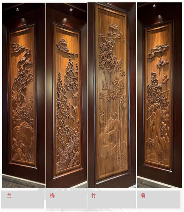 衔接后厅2个过门:梅、兰、竹、菊号称花中四君子,象征着坚韧不拔、谦谦君子、高雅之士和恬然自处的高尚品质。