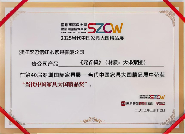 3月18日,深圳国际家具展颁奖典礼上,鎏金奖杯照亮了李忠信红木的荣耀时刻——元首椅从全球327件参赛作品中脱颖而出,荣膺“当代中国家具大国精品奖”。