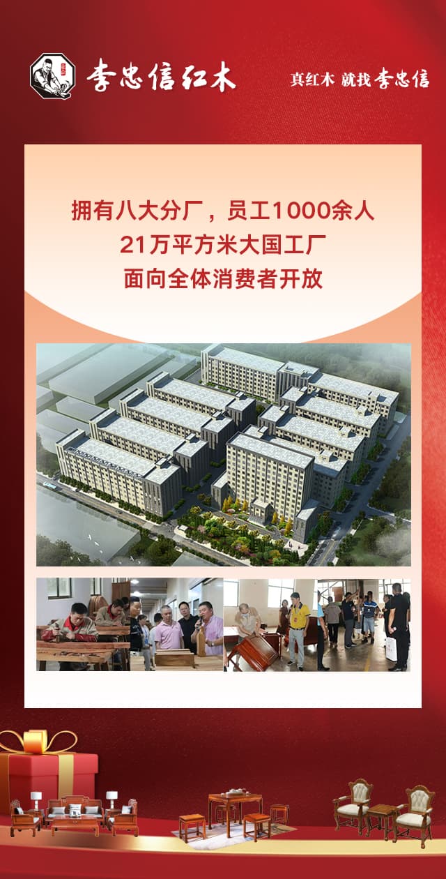 李忠信红木这次五一厂购背后,是强大的工厂支持。八大分厂,21万平方米大国工厂,规模宏大,实力雄厚。先进的生产设备、精湛的工艺技术、严格的质量管控,确保每一件红木家具都经过精心雕琢,品质卓越。从选材到制作,每一个环节都严格把控,只为呈现最完美的红木艺术作品。在这里,您看到的不仅是家具,更是一份匠心的传承。