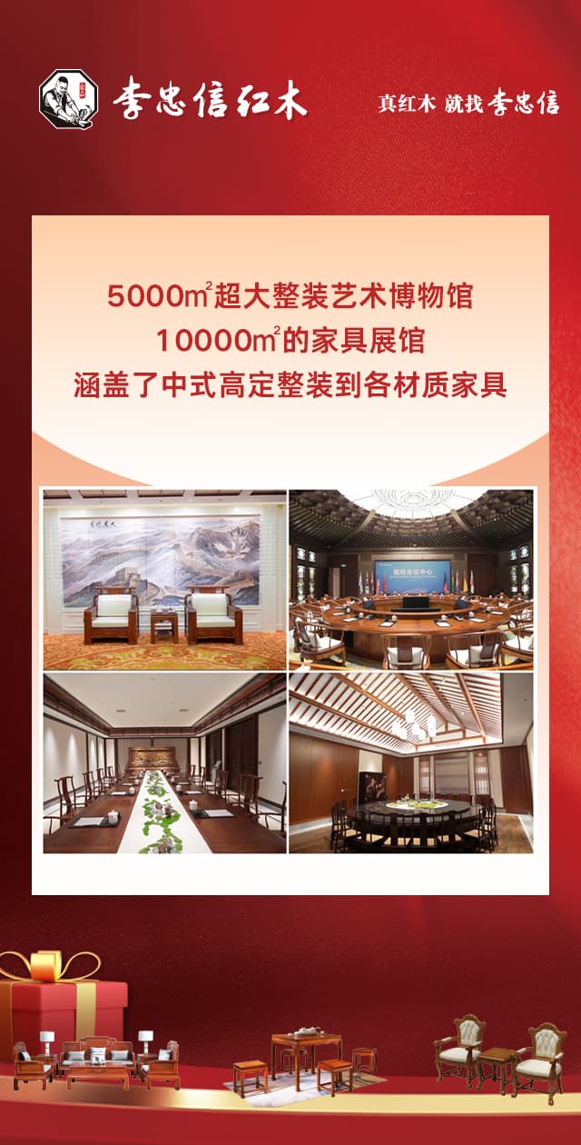 李忠信红木还拥有5000㎡超大整装艺术博物馆和10000㎡的家具展馆,涵盖中式高定整装到各材质家具,这里汇聚了红木文化的精华。在这里,您可以欣赏到中式整装空间的艺术魅力,感受传统文化与现代设计的完美融合。每一件红木家具都承载着深厚的文化底蕴,每一件作品都是一次艺术的传承与创新。