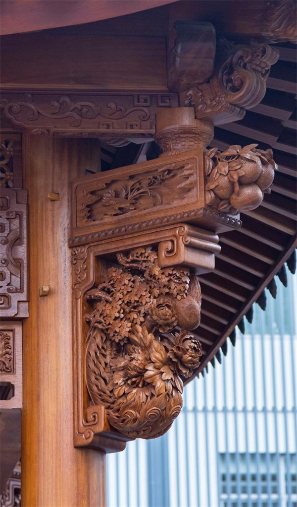 牛腿,作为古建筑中檐柱与梁枋之间的重要构件,在建筑中发挥着承重与装饰的双重作用 。其形状上大下小,犹如牛腿,故而得名 。李忠信艺术馆的牛腿雕花工艺精湛,展现出了古代工匠们的高超技艺和独特匠心 。