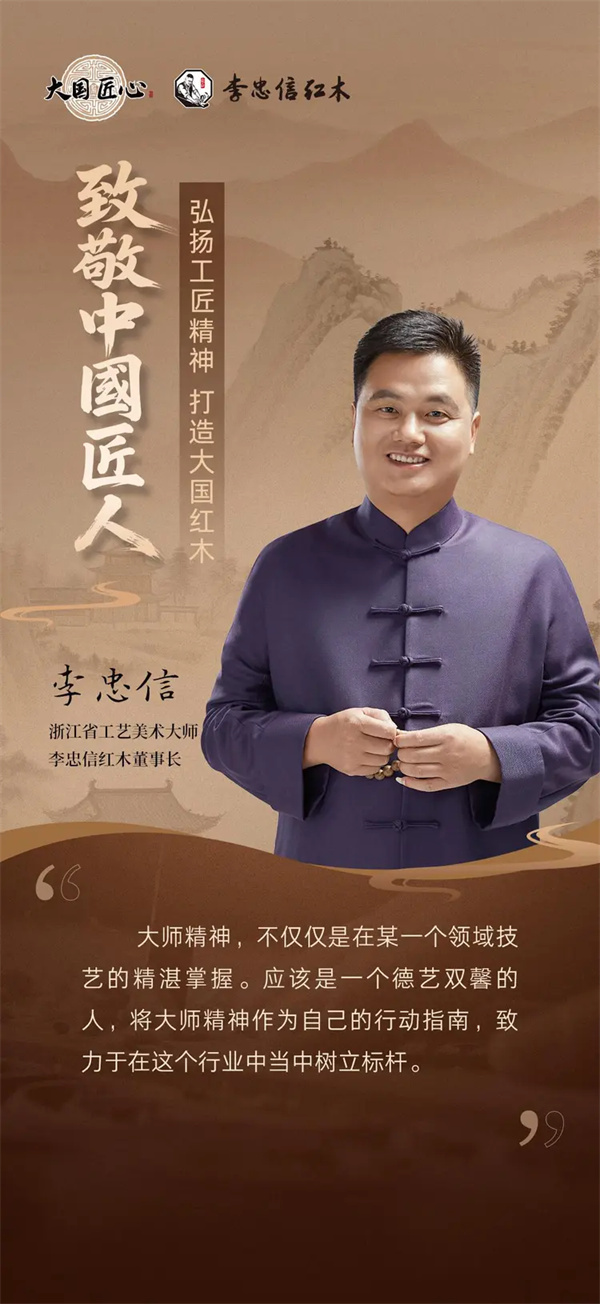 在李忠信红木的发展过程中,他们始终以大师精神为指引,致力于在这个行业中树立标杆。他们用自己的行动诠释了什么是真正的匠心精神。他们用每一件家具,向世界展示着中国红木文化的魅力。