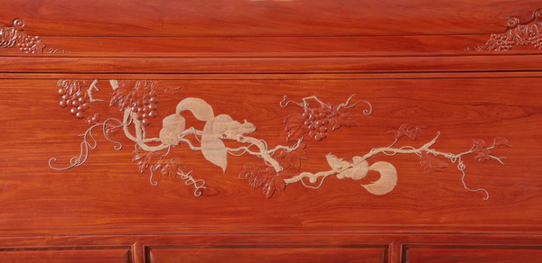 点睛之处,在于其承载深厚文化密码的雕刻。通体装饰传统“缠枝松鼠葡萄纹”,藤蔓卷曲连绵,象征着家族福泽延绵不绝,生生不息;松鼠灵动跳跃于累累葡萄之间,葡萄多籽,自古便是“多子多福”的吉祥符号,松鼠寓意“送子”,更添人丁兴旺、子孙繁茂的圆满祝福。