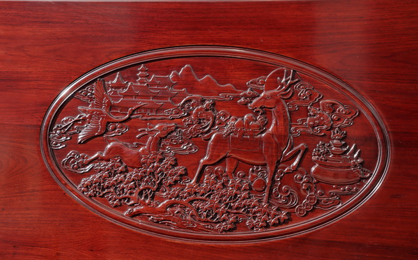 沙发靠背的中心区域,雕刻着中国传统吉祥图案的经典组合——“鹤鹿同春”。鹿,谐音“禄”,象征着福禄、俸禄、事业亨通;仙鹤,则是长寿的化身,寓意健康长寿。鹿鹤相伴,正是“福禄寿喜”中福禄与长寿的完美结合。周围还点缀着象征长寿的寿桃、寓意多子多福的葡萄等,将美好的祝愿集于一身。