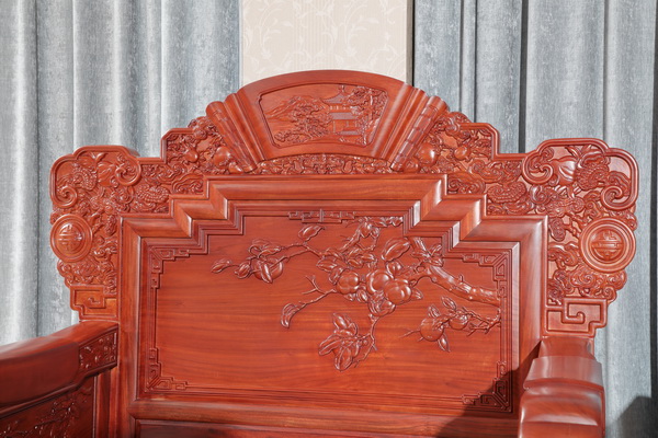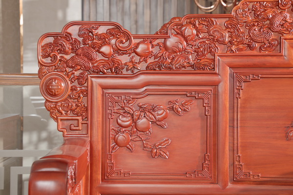 单人位尺寸为长1.17米、宽0.82米、高1.25米,比例协调,坐感舒适。深雕工艺的运用使得图案更加立体生动,尤其是在光线照射下,凹凸之间尽显光影之美。