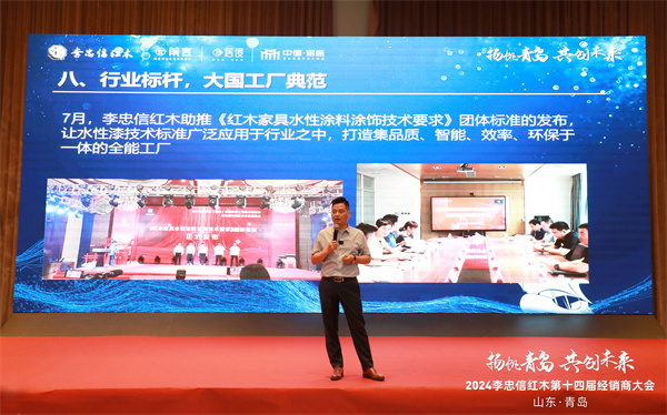 大会伊始,浙江省工艺美术大师、李忠信红木董事长李忠信发表了热情洋溢的致辞。他首先回顾了公司过去一年的成绩与经验,如品牌焕新升级、三度进入人民大会堂、助推《红木家具水性涂料涂饰技术要求》团体标准的发布、吸引《大国工厂》栏目前来探访、激活短视频私域流量等。